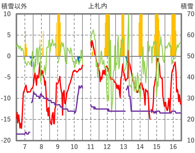 | 日 | 時 | 気温 | 降水 | 風向/風速 | 日照 | 積雪 | 降雪 |