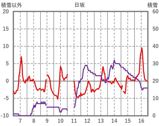 | 日 | 時 | 気温 | 降水 | 風向/風速 | 日照 | 積雪 | 降雪 |
