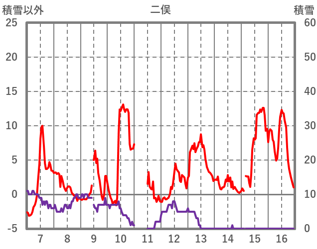 | 日 | 時 | 気温 | 降水 | 風向/風速 | 日照 | 積雪 | 降雪 |