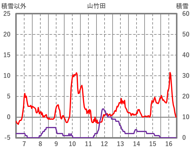 | 日 | 時 | 気温 | 降水 | 風向/風速 | 日照 | 積雪 | 降雪 |