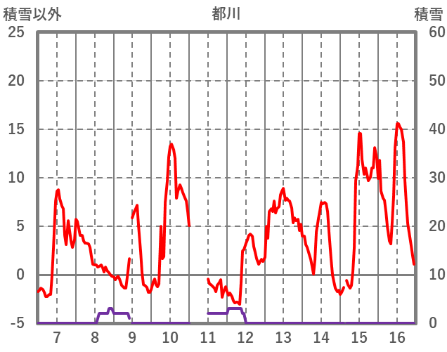 | 日 | 時 | 気温 | 降水 | 風向/風速 | 日照 | 積雪 | 降雪 |
