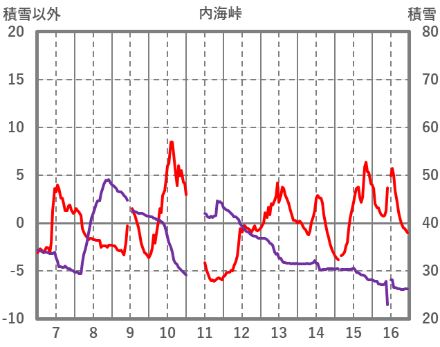 | 日 | 時 | 気温 | 降水 | 風向/風速 | 日照 | 積雪 | 降雪 |