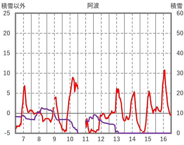 | 日 | 時 | 気温 | 降水 | 風向/風速 | 日照 | 積雪 | 降雪 |