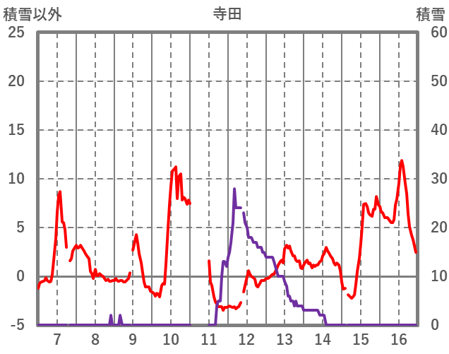 | 日 | 時 | 気温 | 降水 | 風向/風速 | 日照 | 積雪 | 降雪 |