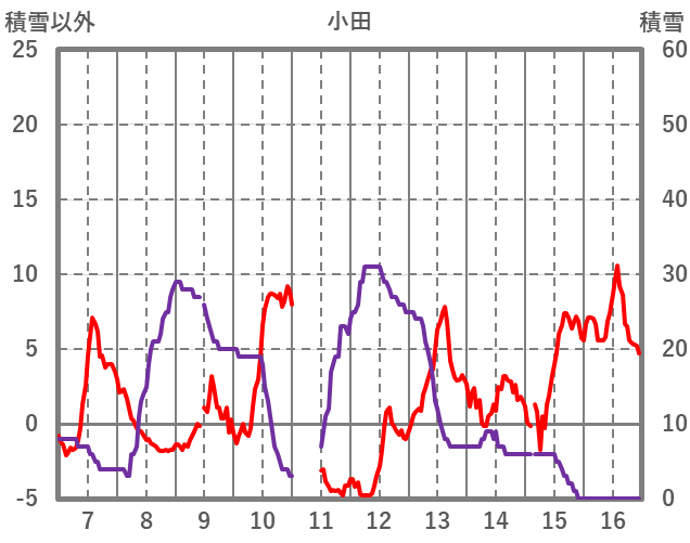 | 日 | 時 | 気温 | 降水 | 風向/風速 | 日照 | 積雪 | 降雪 |