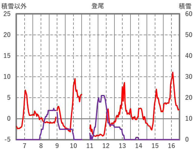 | 日 | 時 | 気温 | 降水 | 風向/風速 | 日照 | 積雪 | 降雪 |