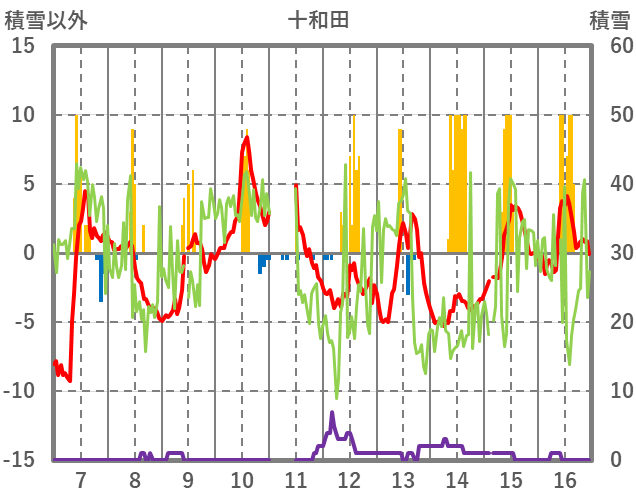| 日 | 時 | 気温 | 降水 | 風向/風速 | 日照 | 積雪 | 降雪 |