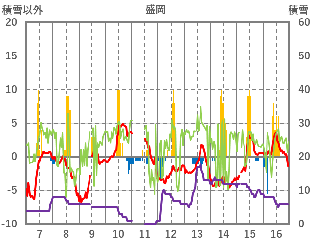 | 日 | 時 | 気温 | 降水 | 風向/風速 | 日照 | 積雪 | 降雪 |
