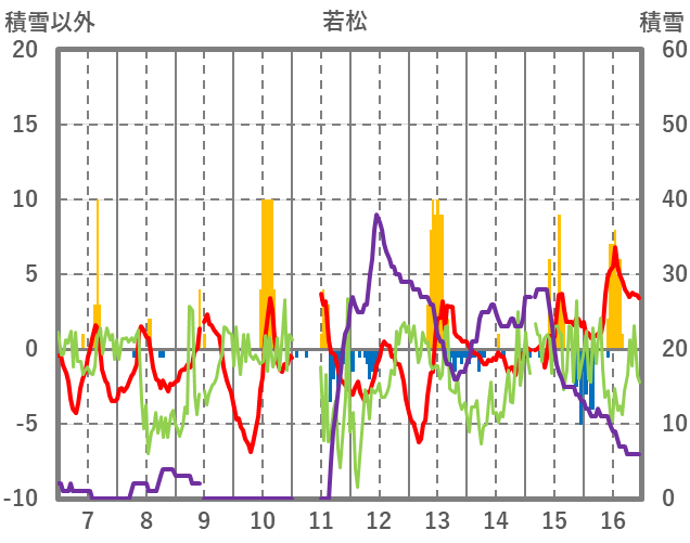| 日 | 時 | 気温 | 降水 | 風向/風速 | 日照 | 積雪 | 降雪 |