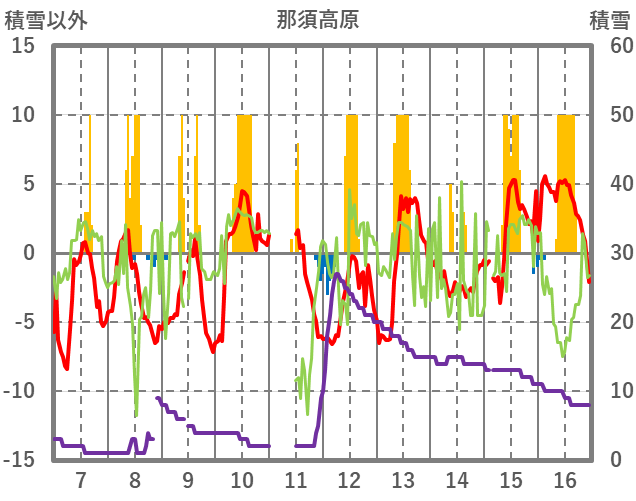 | 日 | 時 | 気温 | 降水 | 風向/風速 | 日照 | 積雪 | 降雪 |