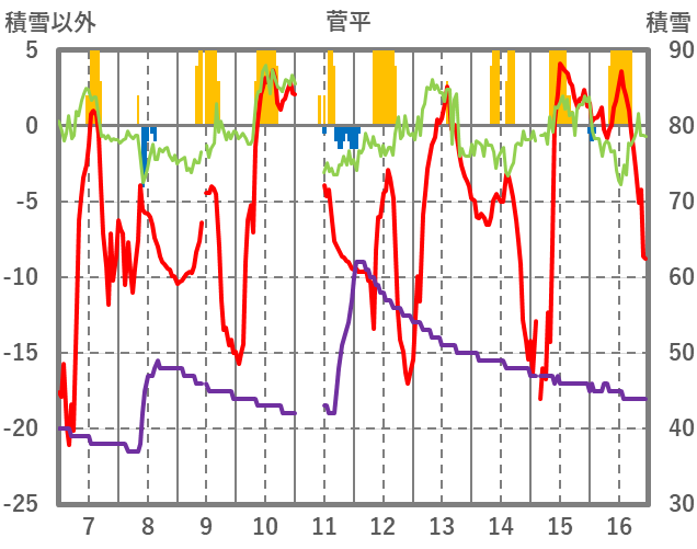| 日 | 時 | 気温 | 降水 | 風向/風速 | 日照 | 積雪 | 降雪 |