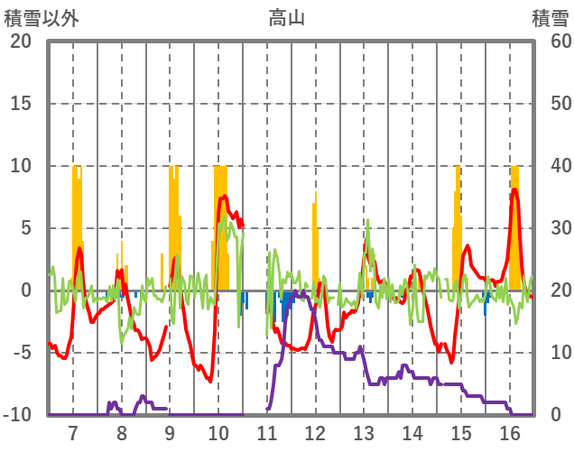| 日 | 時 | 気温 | 降水 | 風向/風速 | 日照 | 積雪 | 降雪 |