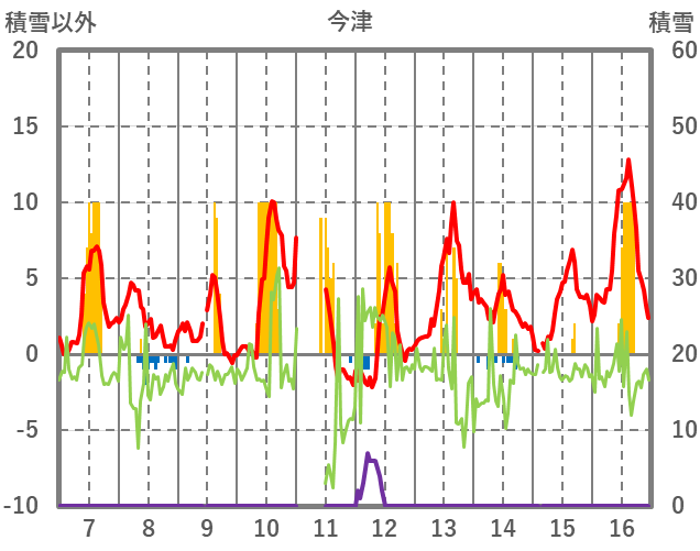 | 日 | 時 | 気温 | 降水 | 風向/風速 | 日照 | 積雪 | 降雪 |