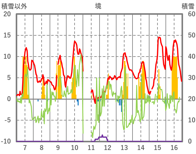 | 日 | 時 | 気温 | 降水 | 風向/風速 | 日照 | 積雪 | 降雪 |
