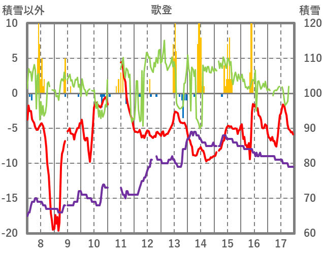 | 日 | 時 | 気温 | 降水 | 風向/風速 | 日照 | 積雪 | 降雪 |