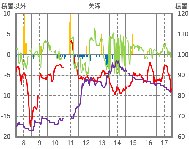 | 日 | 時 | 気温 | 降水 | 風向/風速 | 日照 | 積雪 | 降雪 |