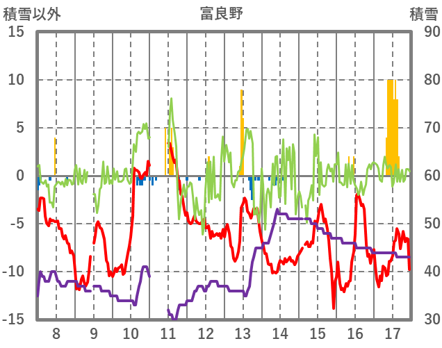 | 日 | 時 | 気温 | 降水 | 風向/風速 | 日照 | 積雪 | 降雪 |