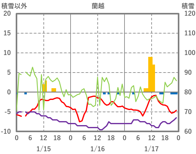 | 日 | 時 | 気温 | 降水 | 風向/風速 | 日照 | 積雪 | 降雪 |