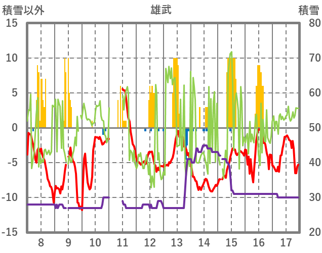 | 日 | 時 | 気温 | 降水 | 風向/風速 | 日照 | 積雪 | 降雪 |