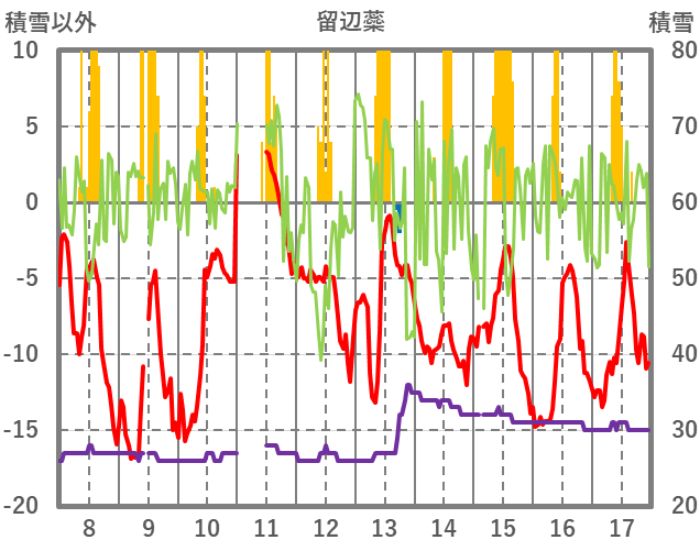 | 日 | 時 | 気温 | 降水 | 風向/風速 | 日照 | 積雪 | 降雪 |