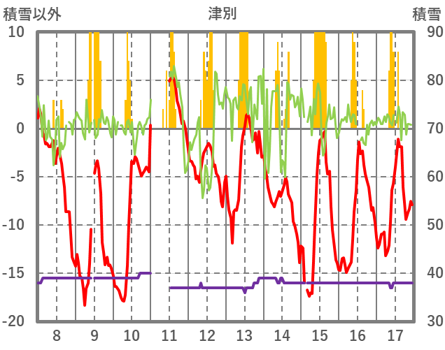 | 日 | 時 | 気温 | 降水 | 風向/風速 | 日照 | 積雪 | 降雪 |