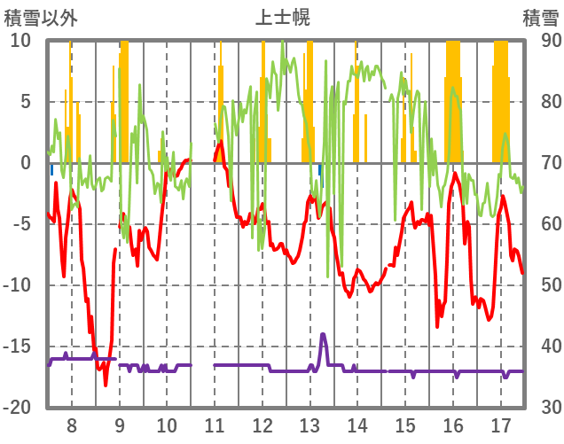 | 日 | 時 | 気温 | 降水 | 風向/風速 | 日照 | 積雪 | 降雪 |