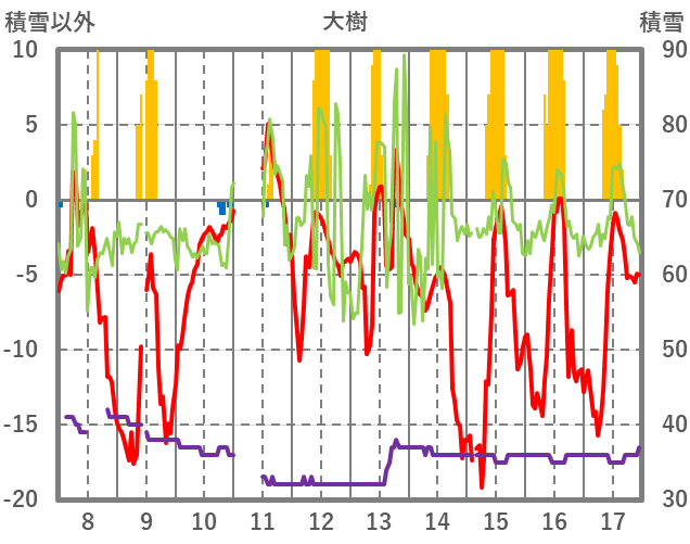| 日 | 時 | 気温 | 降水 | 風向/風速 | 日照 | 積雪 | 降雪 |