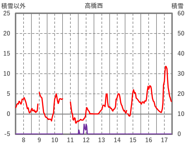 | 日 | 時 | 気温 | 降水 | 風向/風速 | 日照 | 積雪 | 降雪 |