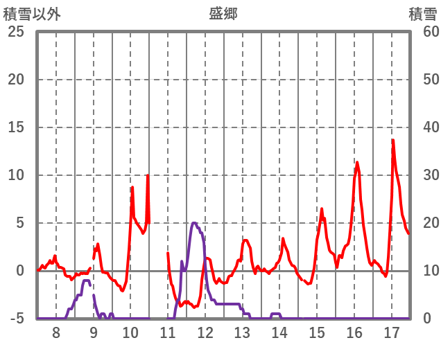 | 日 | 時 | 気温 | 降水 | 風向/風速 | 日照 | 積雪 | 降雪 |