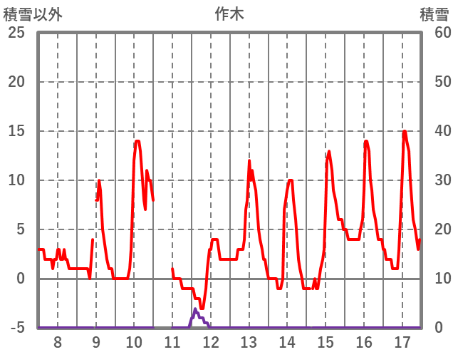 | 日 | 時 | 気温 | 降水 | 風向/風速 | 日照 | 積雪 | 降雪 |