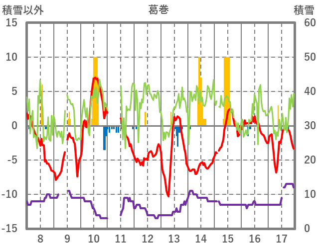| 日 | 時 | 気温 | 降水 | 風向/風速 | 日照 | 積雪 | 降雪 |