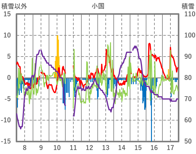 | 日 | 時 | 気温 | 降水 | 風向/風速 | 日照 | 積雪 | 降雪 |