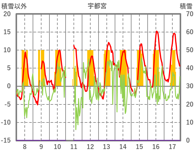 | 日 | 時 | 気温 | 降水 | 風向/風速 | 日照 | 積雪 | 降雪 |