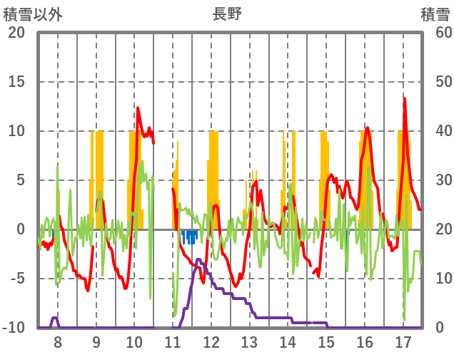 | 日 | 時 | 気温 | 降水 | 風向/風速 | 日照 | 積雪 | 降雪 |