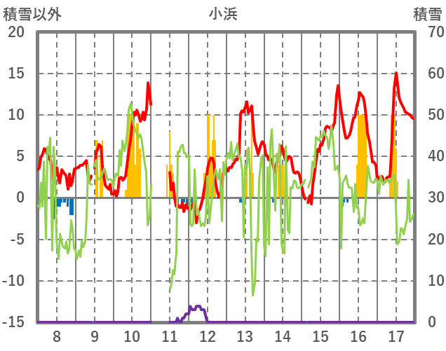 | 日 | 時 | 気温 | 降水 | 風向/風速 | 日照 | 積雪 | 降雪 |