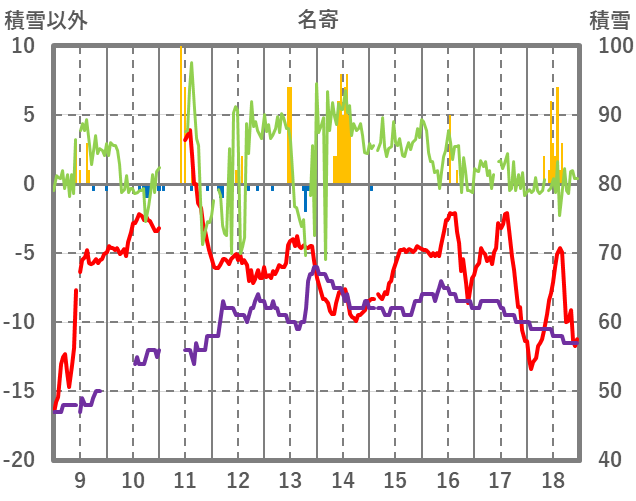| 日 | 時 | 気温 | 降水 | 風向/風速 | 日照 | 積雪 | 降雪 |