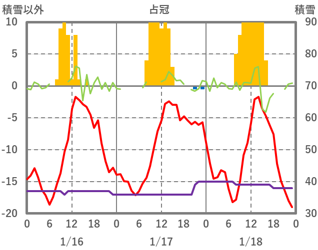 | 日 | 時 | 気温 | 降水 | 風向/風速 | 日照 | 積雪 | 降雪 |