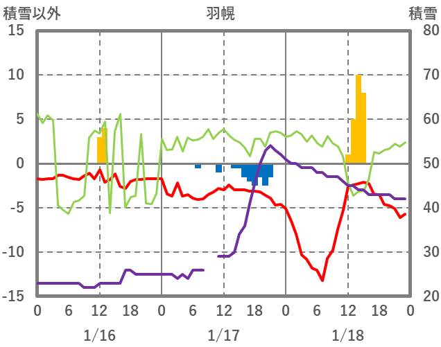 | 日 | 時 | 気温 | 降水 | 風向/風速 | 日照 | 積雪 | 降雪 |