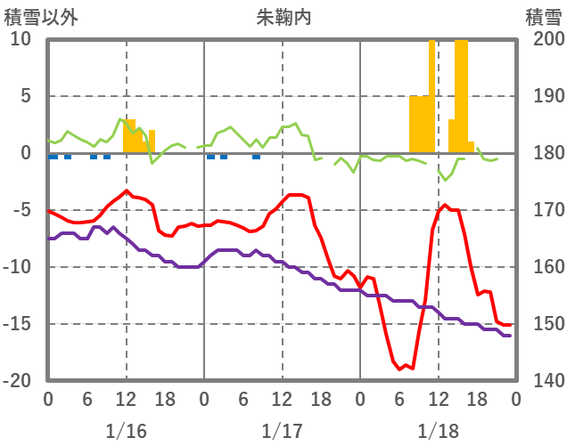 | 日 | 時 | 気温 | 降水 | 風向/風速 | 日照 | 積雪 | 降雪 |