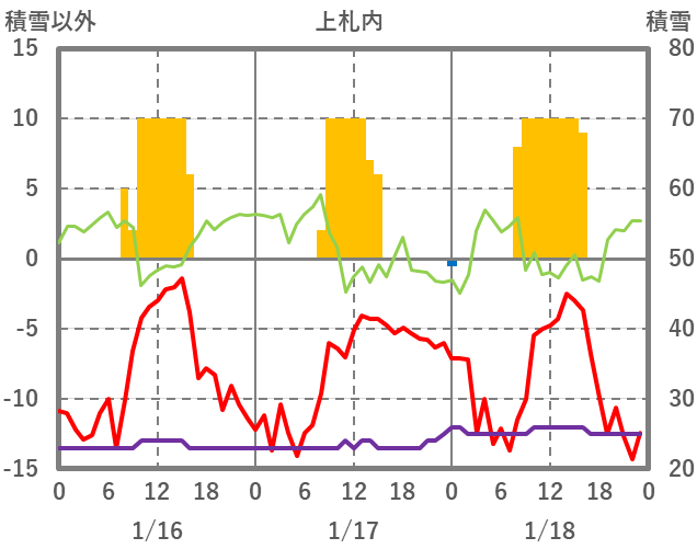 | 日 | 時 | 気温 | 降水 | 風向/風速 | 日照 | 積雪 | 降雪 |