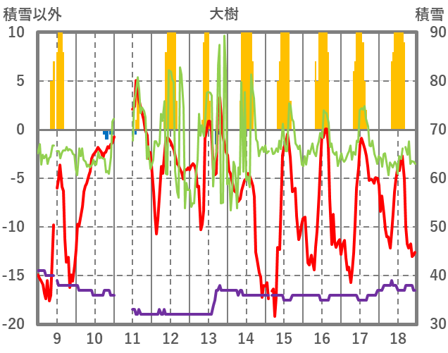 | 日 | 時 | 気温 | 降水 | 風向/風速 | 日照 | 積雪 | 降雪 |