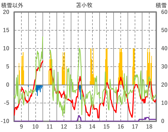 | 日 | 時 | 気温 | 降水 | 風向/風速 | 日照 | 積雪 | 降雪 |