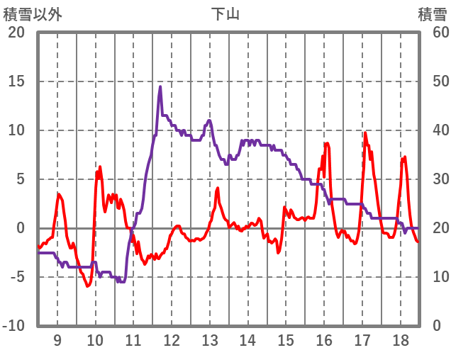 | 日 | 時 | 気温 | 降水 | 風向/風速 | 日照 | 積雪 | 降雪 |