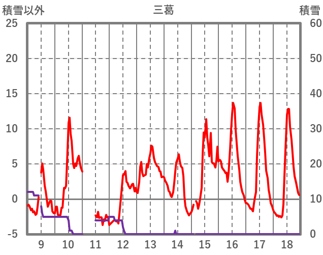 | 日 | 時 | 気温 | 降水 | 風向/風速 | 日照 | 積雪 | 降雪 |