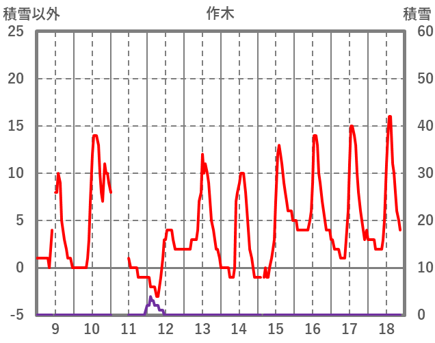 | 日 | 時 | 気温 | 降水 | 風向/風速 | 日照 | 積雪 | 降雪 |