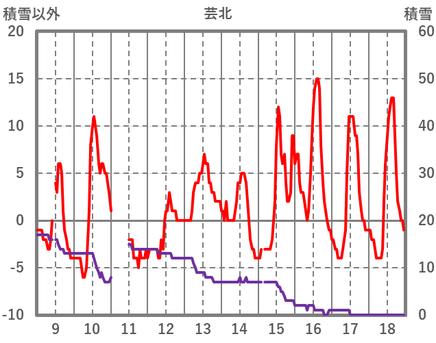 | 日 | 時 | 気温 | 降水 | 風向/風速 | 日照 | 積雪 | 降雪 |