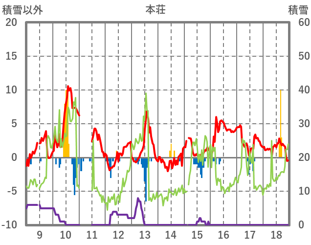 | 日 | 時 | 気温 | 降水 | 風向/風速 | 日照 | 積雪 | 降雪 |