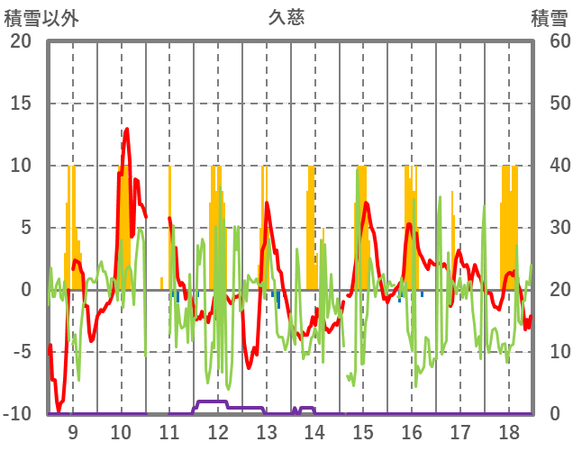 | 日 | 時 | 気温 | 降水 | 風向/風速 | 日照 | 積雪 | 降雪 |