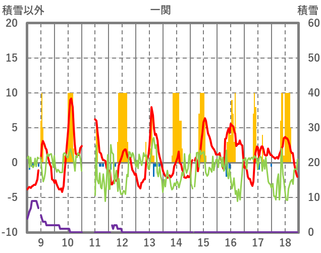 | 日 | 時 | 気温 | 降水 | 風向/風速 | 日照 | 積雪 | 降雪 |