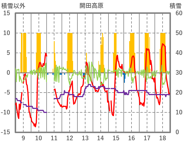 | 日 | 時 | 気温 | 降水 | 風向/風速 | 日照 | 積雪 | 降雪 |